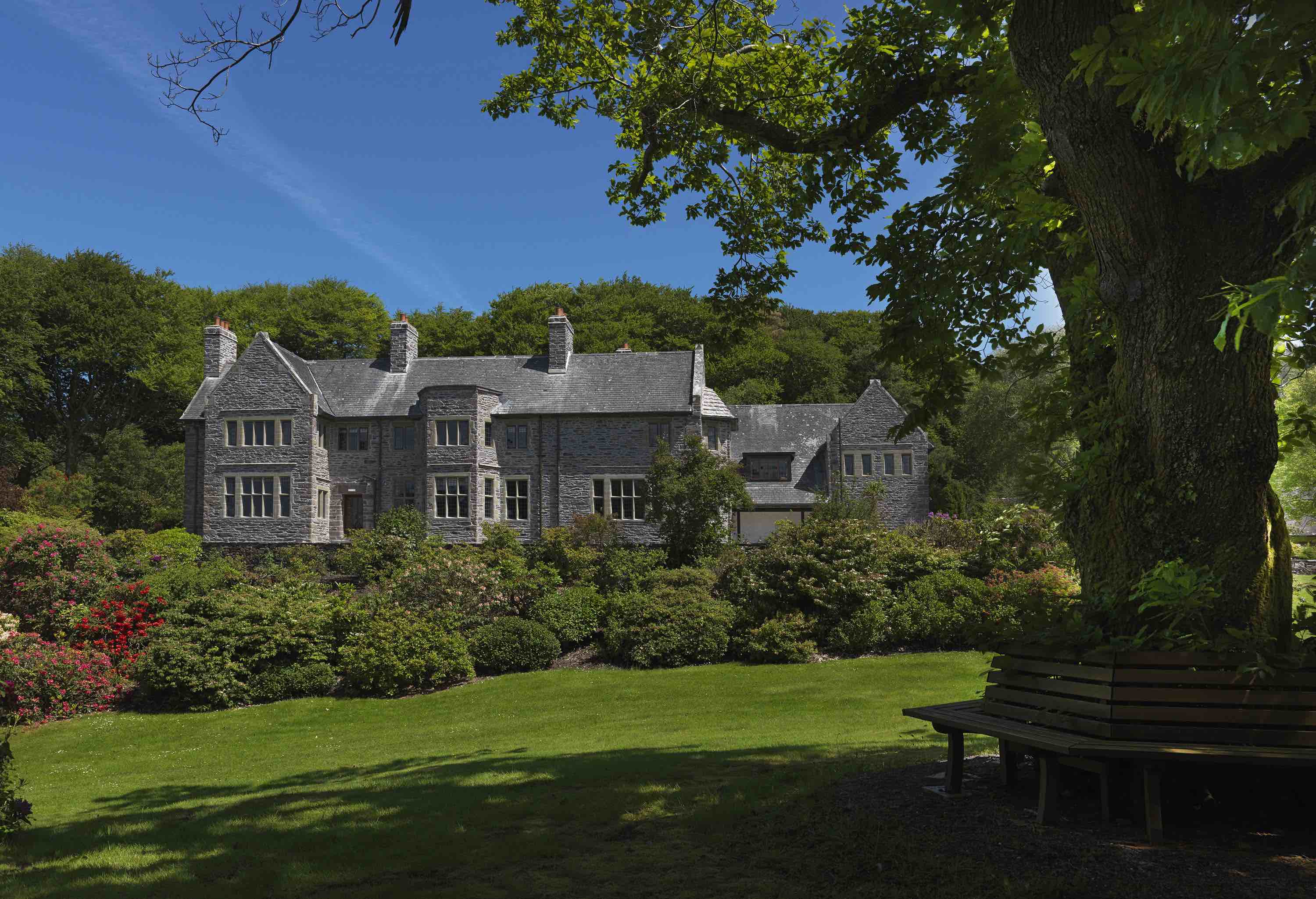 Few original internal features survived, other than a couple of chimney pieces and a small number of cornices. All of the original steel framed leaded casement windows were repaired and the stone exterior repointed in lime. The work included the radical re-planning of all bedrooms and public areas, while the original oak staircase was remodelled and opened up around a new oak panelled double height hall, with green Westmorland slate floors (replicating the roof coverings that had survived). We provided a full interior design service with all rooms having a different design, using fabrics and wall papers from Morris & Co. We designed new furniture and oversaw the careful restoration of antique furniture, rugs, paintings and prints. We also provided landscape design services and completed a second phase of work to provide nine rooms in the detached garden house.